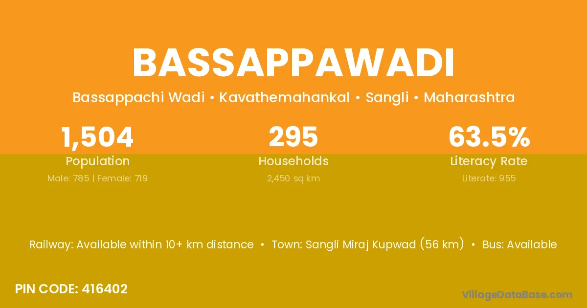 Bassappawadi village has a total population of 1,504 people, of which 785 are males and 719 are females.