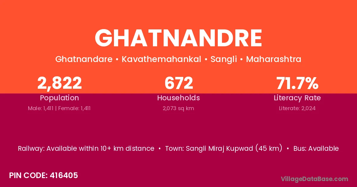 Sangli Miraj Kupwad (45 km) is the nearest town to Ghatnandre village for major economic activities and is located approximately 45 km away.