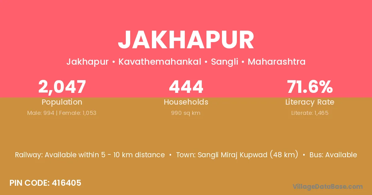 Sangli Miraj Kupwad (48 km) is the nearest town to Jakhapur village for major economic activities and is located approximately 48 km away.