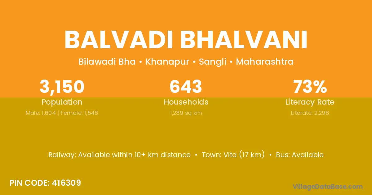 Vita (17 km) is the nearest town to Balvadi Bhalvani village for major economic activities and is located approximately 17 km away.