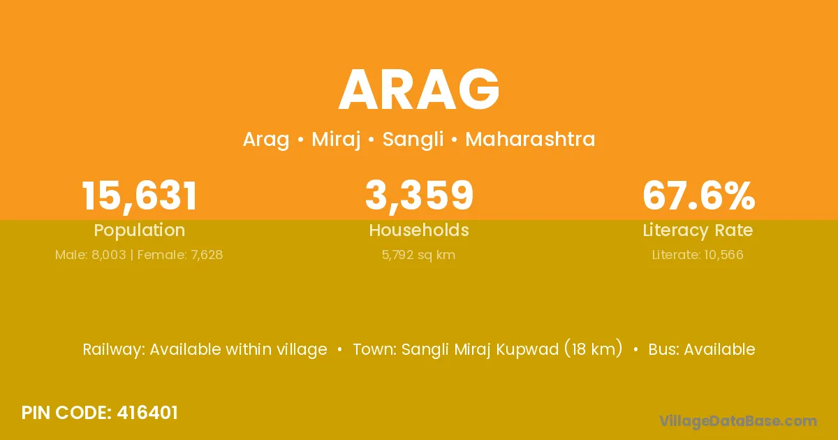 Sangli Miraj Kupwad (18 km) is the nearest town to Arag village for major economic activities and is located approximately 18 km away.