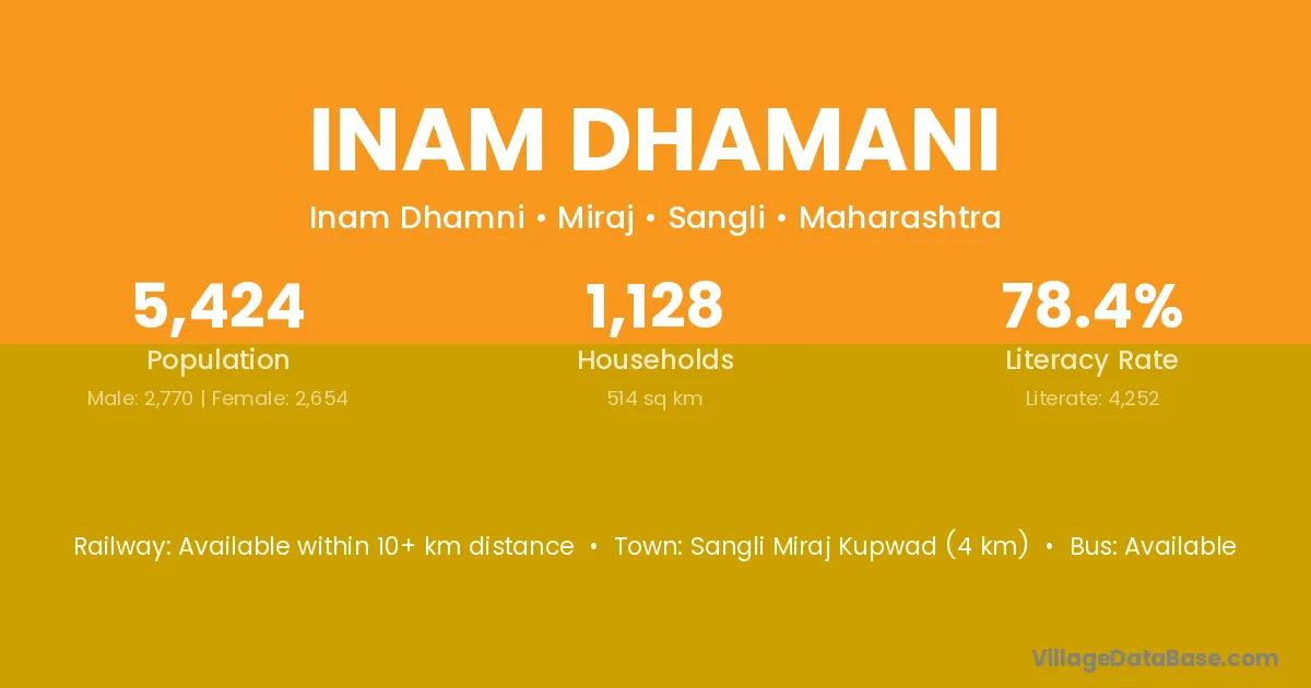 Sangli Miraj Kupwad (4 km) is the nearest town to Inam Dhamani village for major economic activities and is located approximately 4 km away.