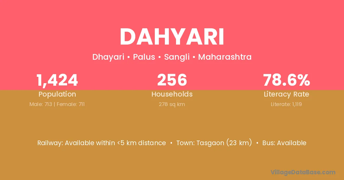 Tasgaon (23 km) is the nearest town to Dahyari village for major economic activities and is located approximately 23 km away.