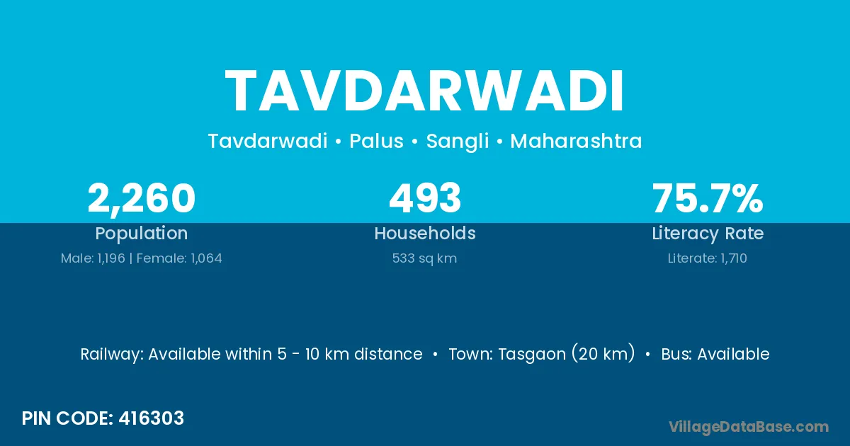 Tasgaon (20 km) is the nearest town to Tavdarwadi village for major economic activities and is located approximately 20 km away.