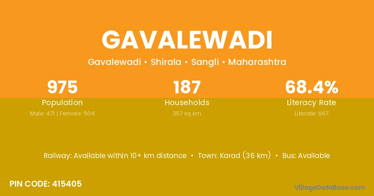 Gavalewadi village has a total population of 975 people, of which 471 are males and 504 are females.