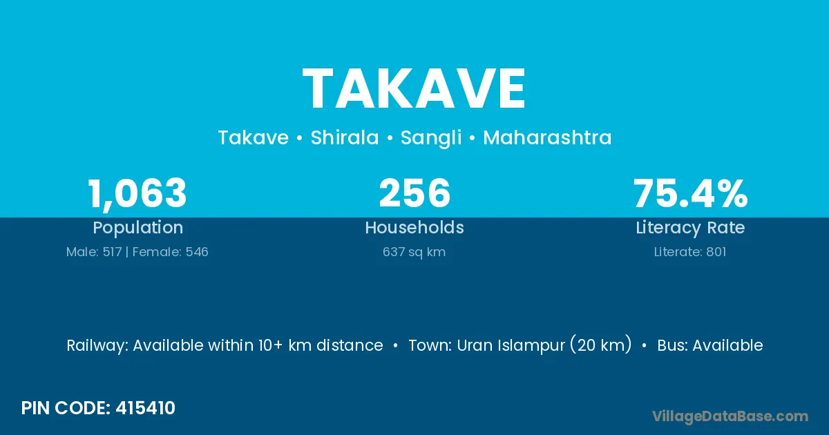 Uran Islampur (20 km) is the nearest town to Takave village for major economic activities and is located approximately 20 km away.