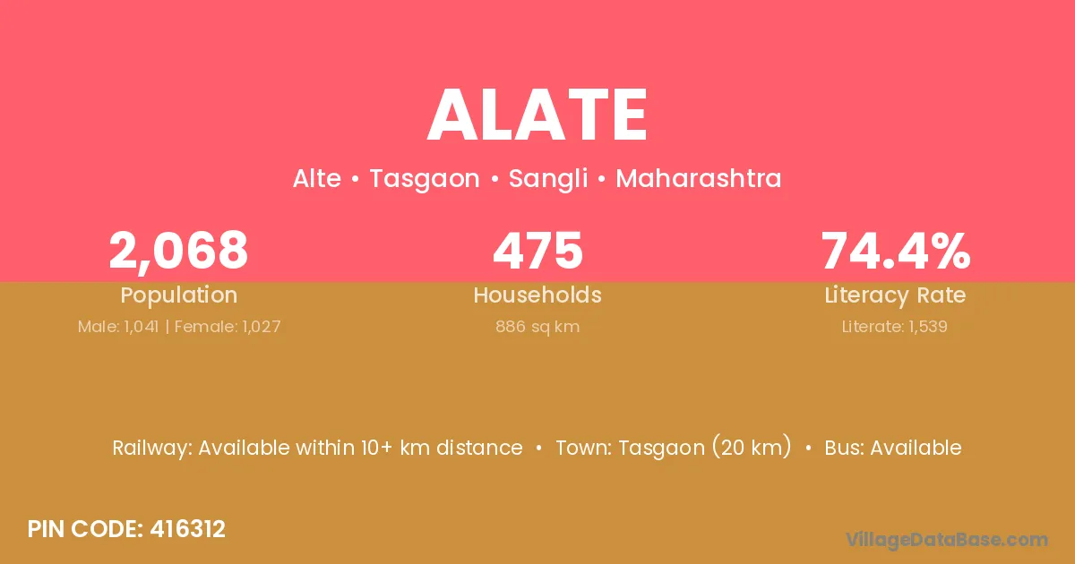 Tasgaon (20 km) is the nearest town to Alate village for major economic activities and is located approximately 20 km away.