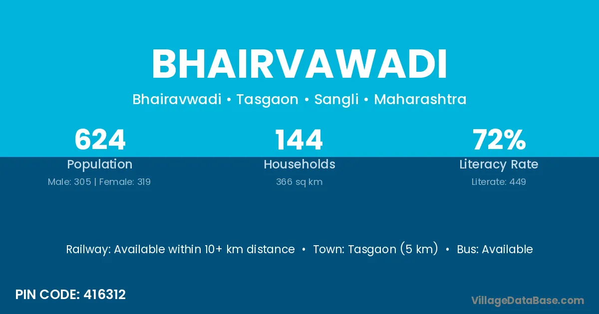 Bhairvawadi village has a total population of 624 people, of which 305 are males and 319 are females.
