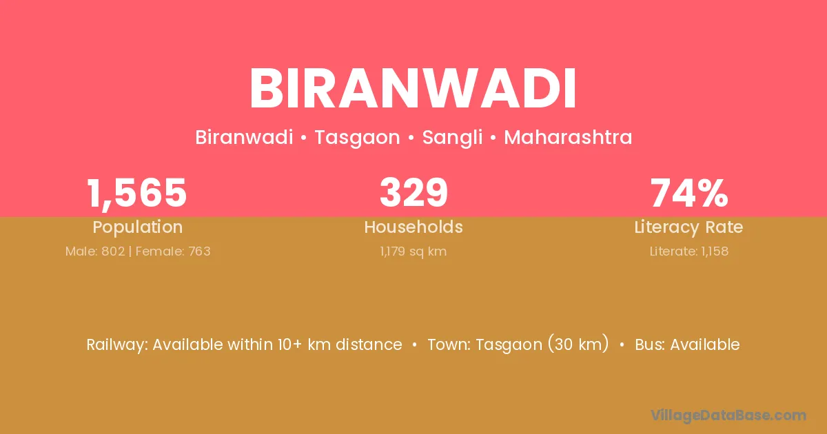 Tasgaon (30 km) is the nearest town to Biranwadi village for major economic activities and is located approximately 30 km away.