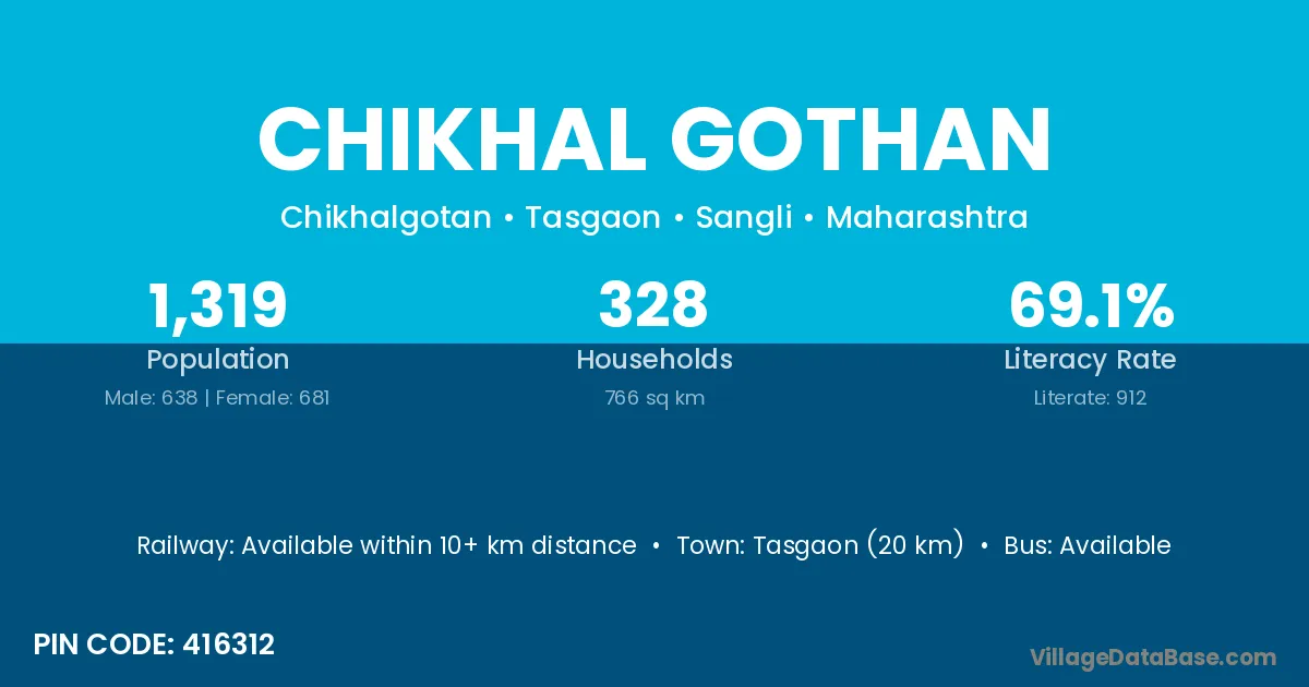 Tasgaon (20 km) is the nearest town to Chikhal Gothan village for major economic activities and is located approximately 20 km away.