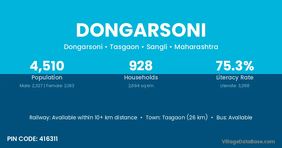 Tasgaon (26 km) is the nearest town to Dongarsoni village for major economic activities and is located approximately 26 km away.