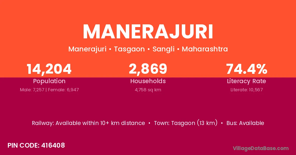 Tasgaon (13 km) is the nearest town to Manerajuri village for major economic activities and is located approximately 13 km away.