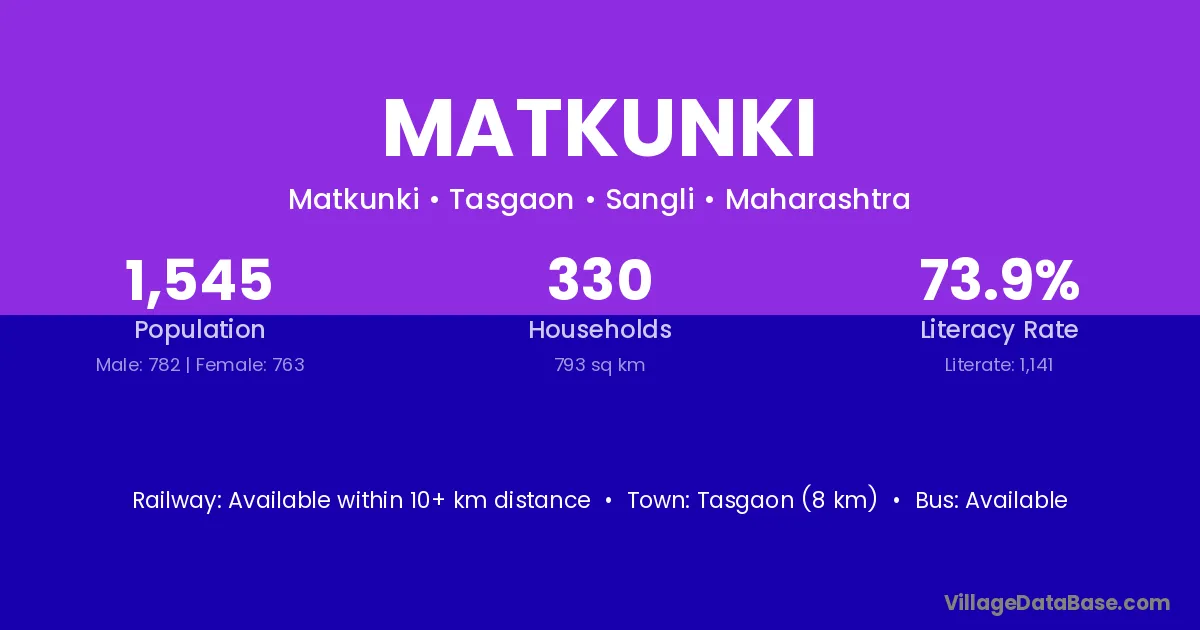 Tasgaon (8 km) is the nearest town to Matkunki village for major economic activities and is located approximately 8 km away.