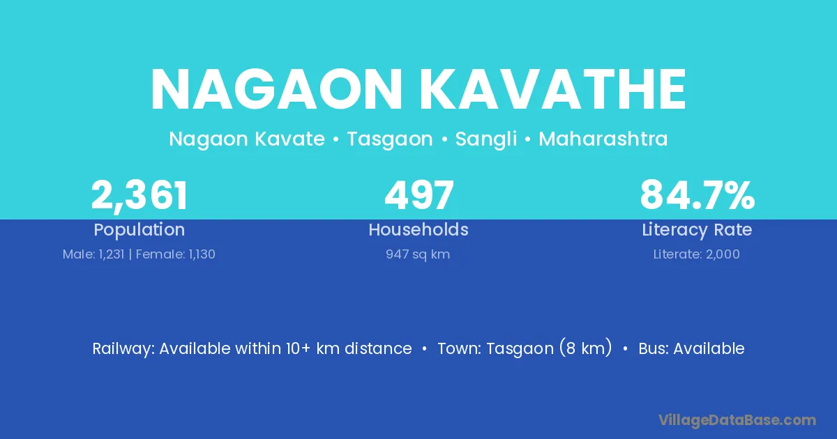 Nagaon Kavathe village has a total population of 2,361 people, of which 1,231 are males and 1,130 are females.