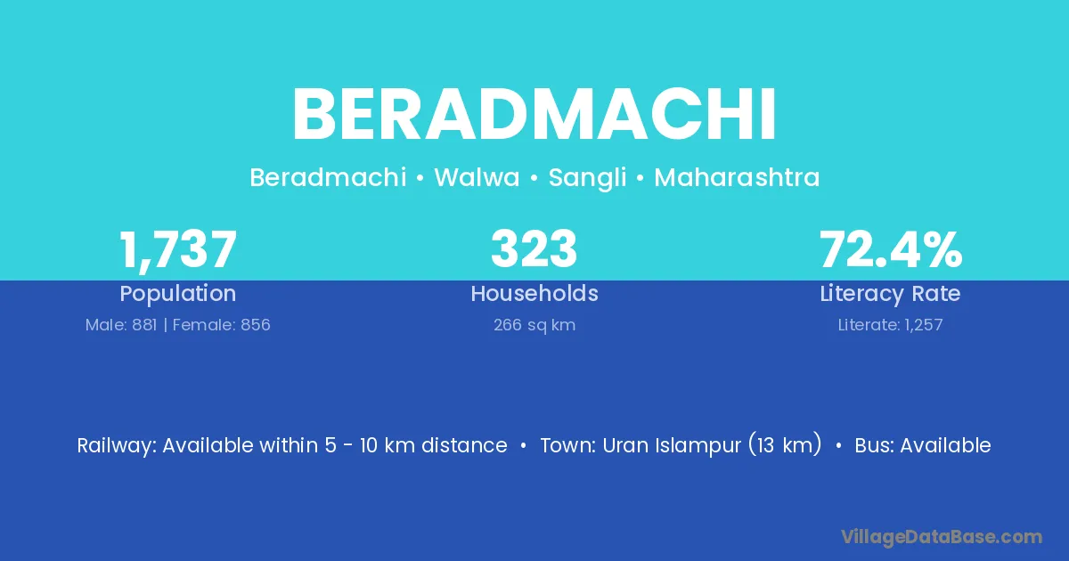 Beradmachi village has a total population of 1,737 people, of which 881 are males and 856 are females.