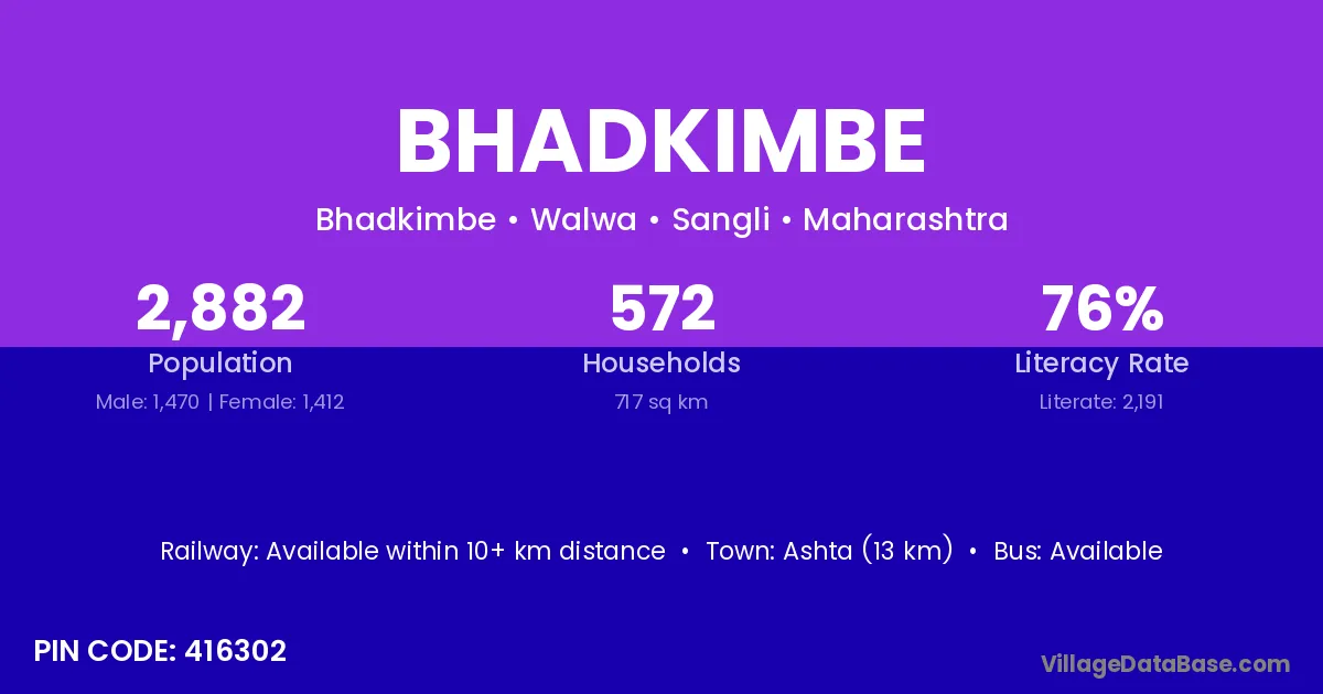 Ashta (13 km) is the nearest town to Bhadkimbe village for major economic activities and is located approximately 13 km away.