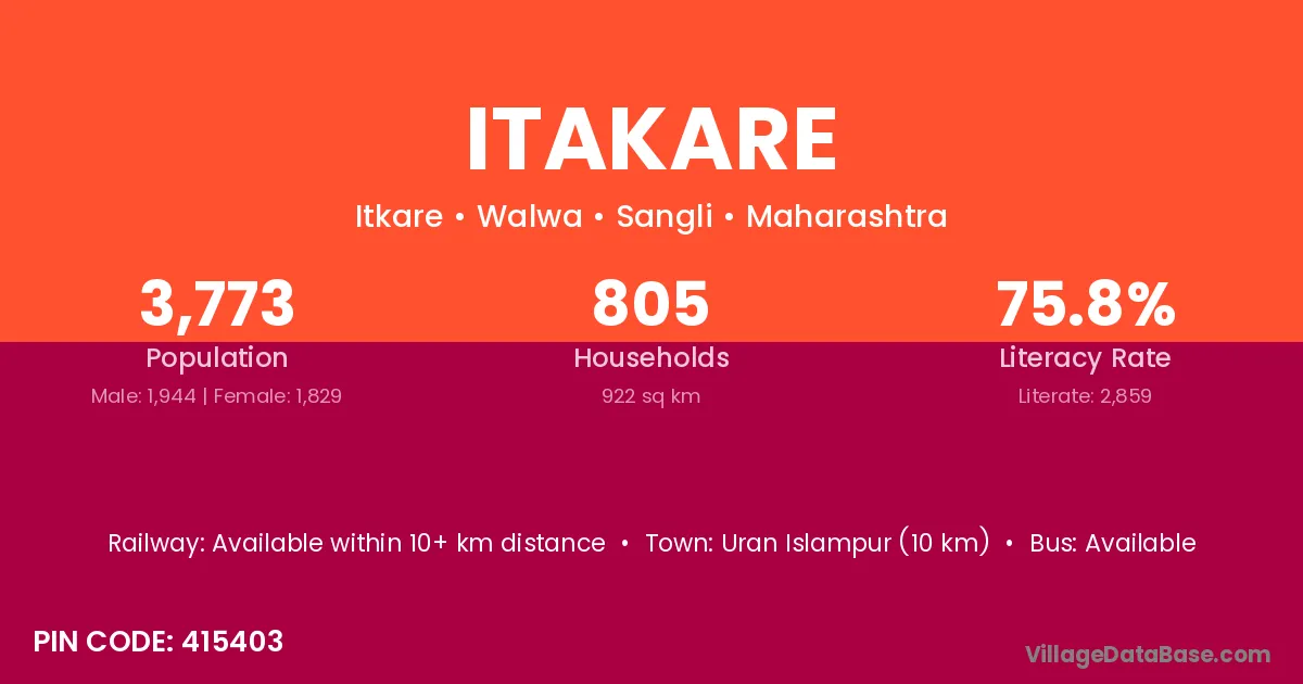 Itakare village has a total population of 3,773 people, of which 1,944 are males and 1,829 are females.