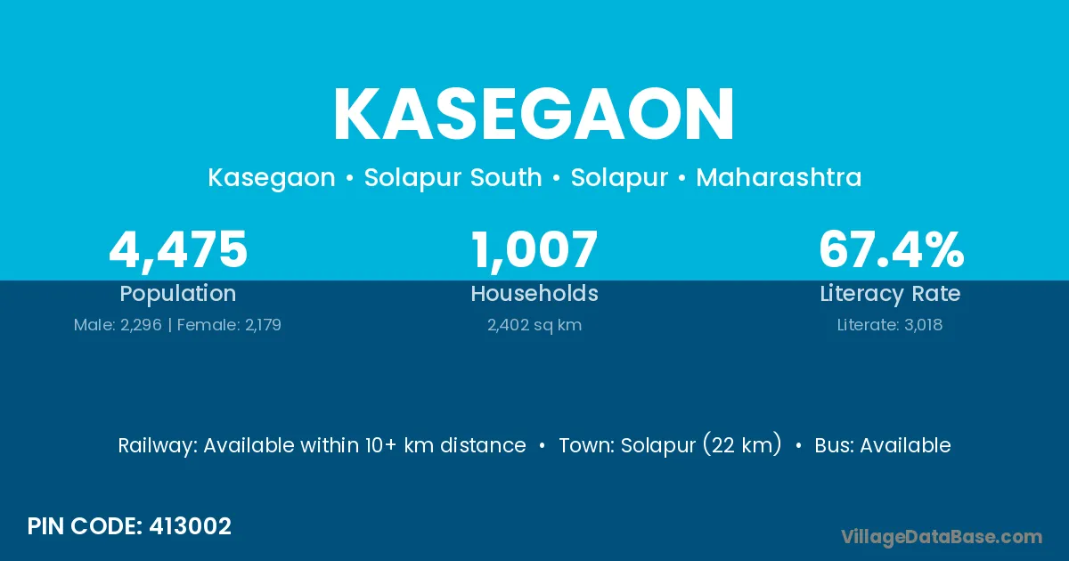 Kasegaon village has a total population of 13,581 people, of which 7,012 are males and 6,569 are females.