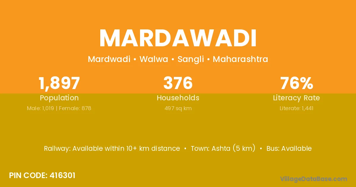 Ashta (5 km) is the nearest town to Mardawadi village for major economic activities and is located approximately 5 km away.