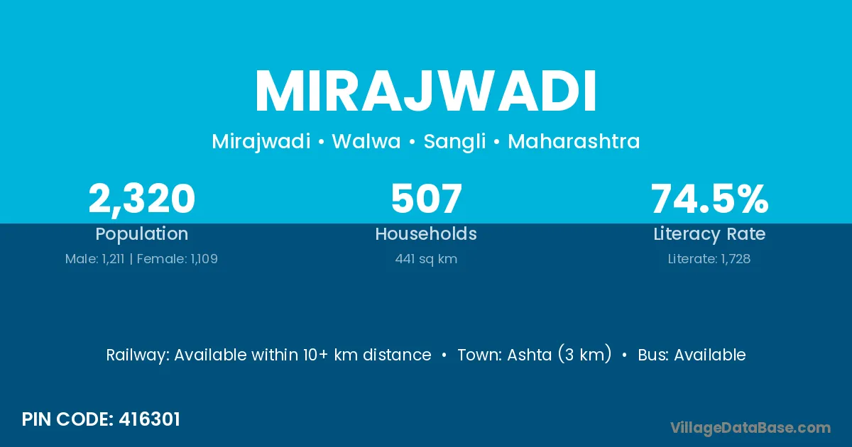 Ashta (3 km) is the nearest town to Mirajwadi village for major economic activities and is located approximately 3 km away.