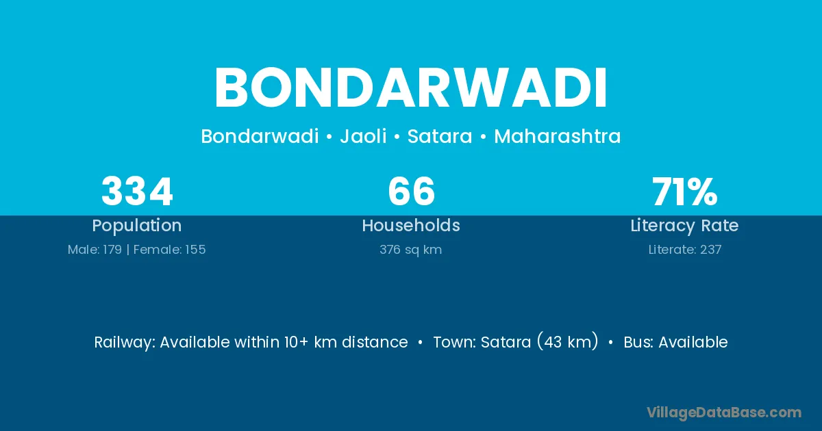 Satara (43 km) is the nearest town to Bondarwadi village for major economic activities and is located approximately 43 km away.