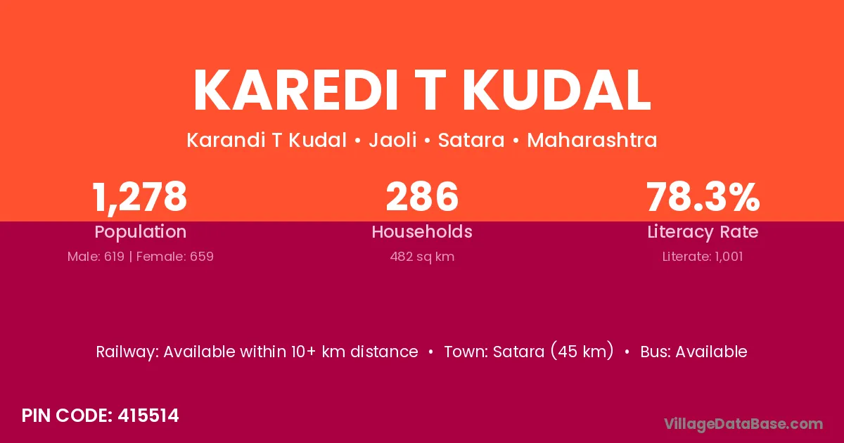 Satara (45 km) is the nearest town to Karedi T Kudal village for major economic activities and is located approximately 45 km away.