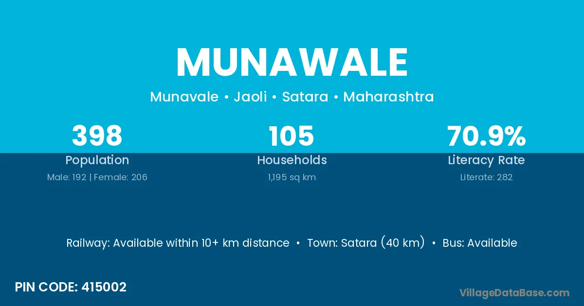 Satara (40 km) is the nearest town to Munawale village for major economic activities and is located approximately 40 km away.