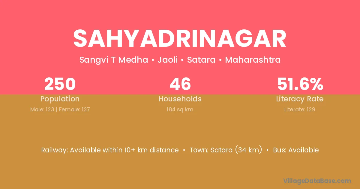 Satara (34 km) is the nearest town to Sahyadrinagar village for major economic activities and is located approximately 34 km away.