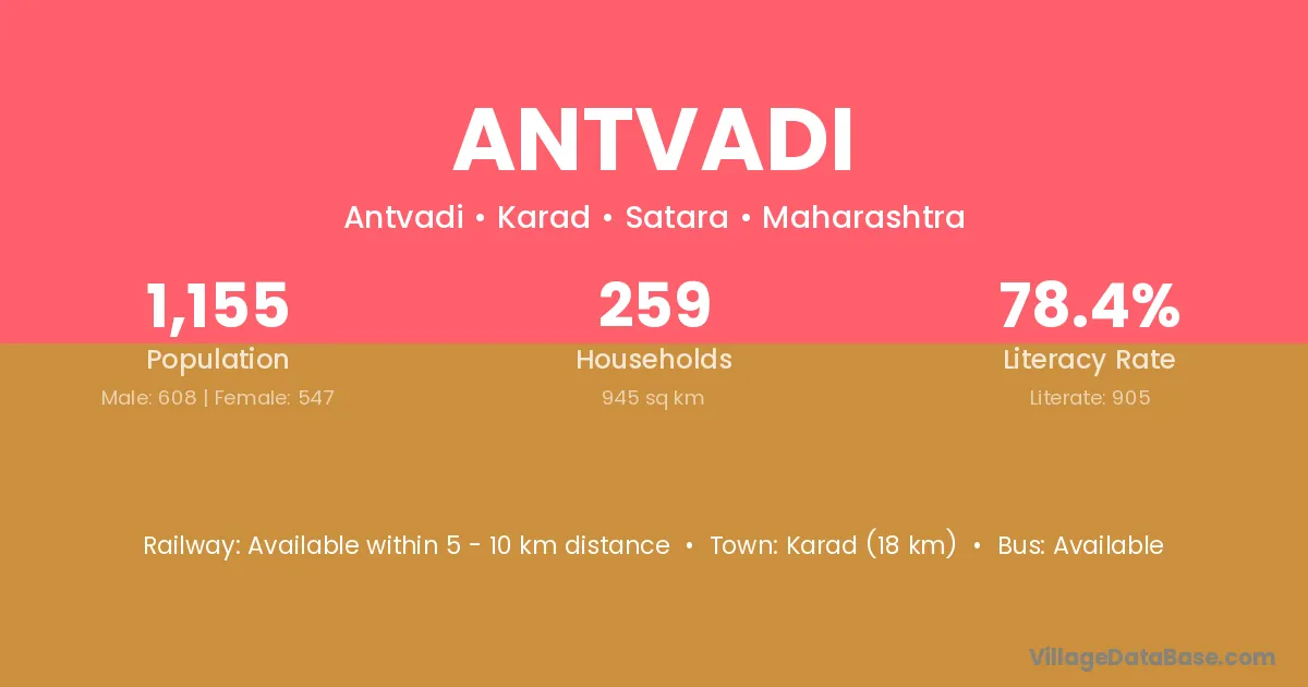 Karad (18 km) is the nearest town to Antvadi village for major economic activities and is located approximately 18 km away.