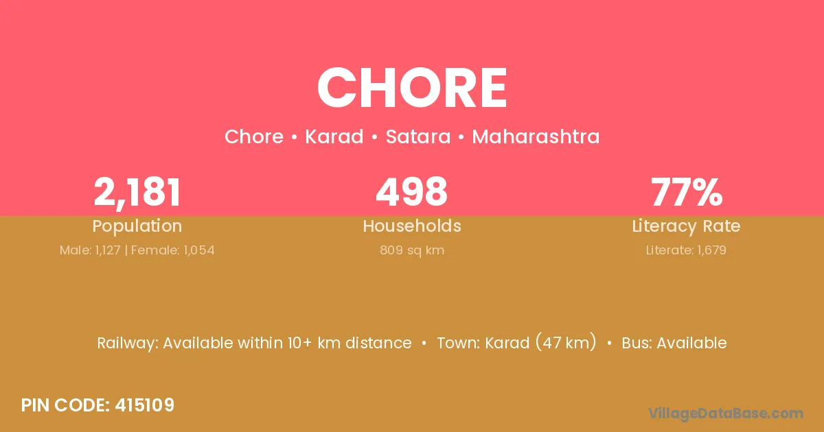 Karad (47 km) is the nearest town to Chore village for major economic activities and is located approximately 47 km away.