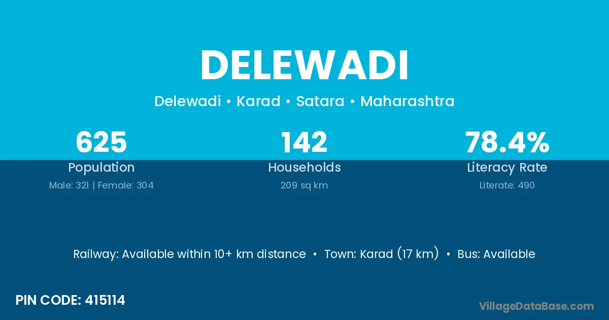 Karad (17 km) is the nearest town to Delewadi village for major economic activities and is located approximately 17 km away.