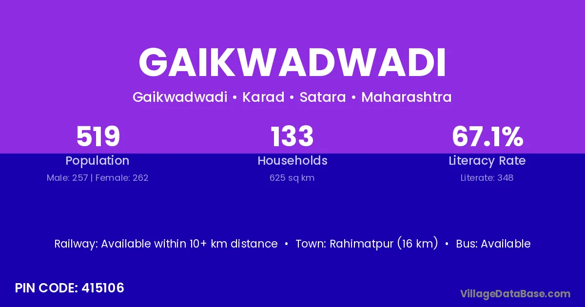 Gaikwadwadi village has a total population of 519 people, of which 257 are males and 262 are females.