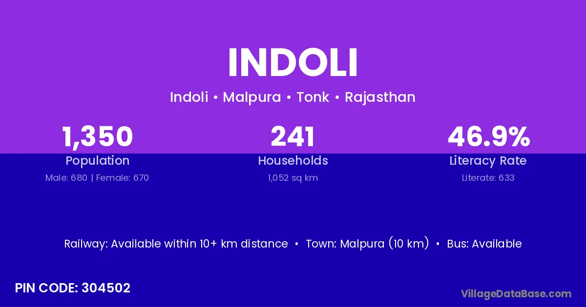 The literacy rate of Indoli village is 73.77%. Male literacy stands at 78.51% and female literacy at 68.92%.