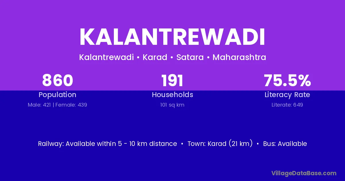 Karad (21 km) is the nearest town to Kalantrewadi village for major economic activities and is located approximately 21 km away.