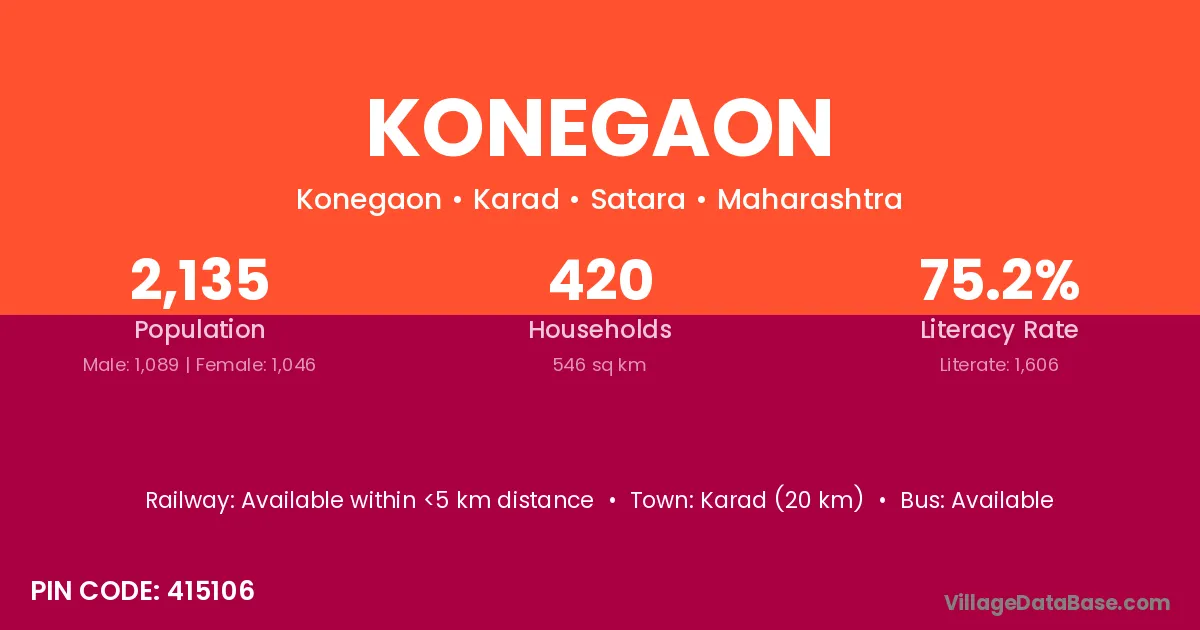 Karad (20 km) is the nearest town to Konegaon village for major economic activities and is located approximately 20 km away.