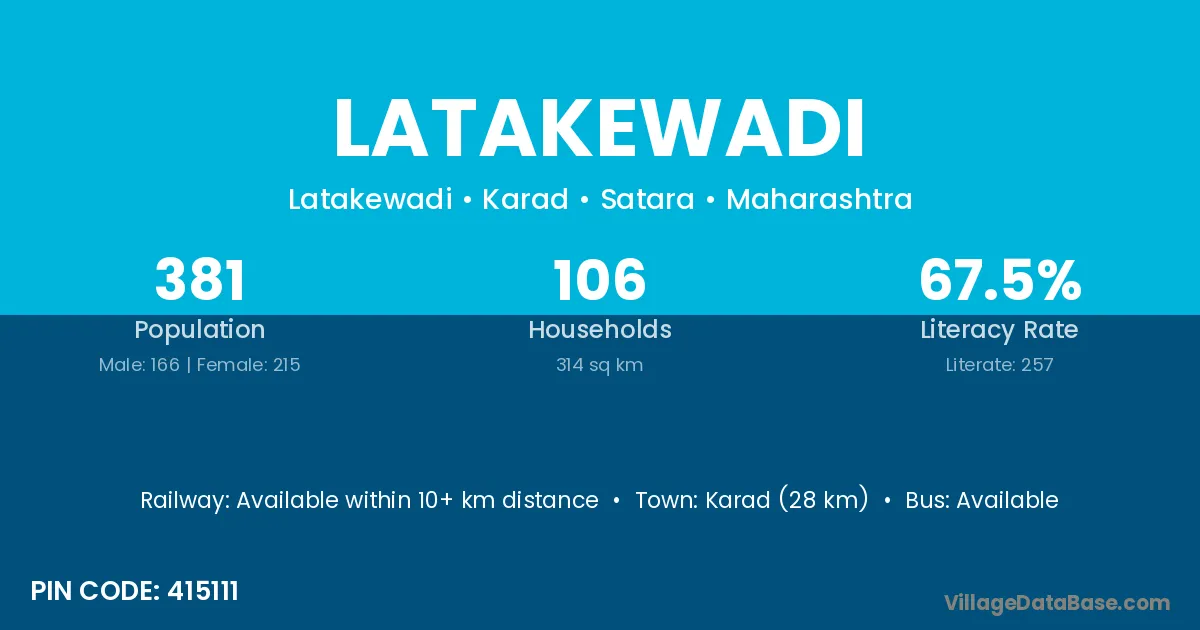 Latakewadi village has a total population of 381 people, of which 166 are males and 215 are females.