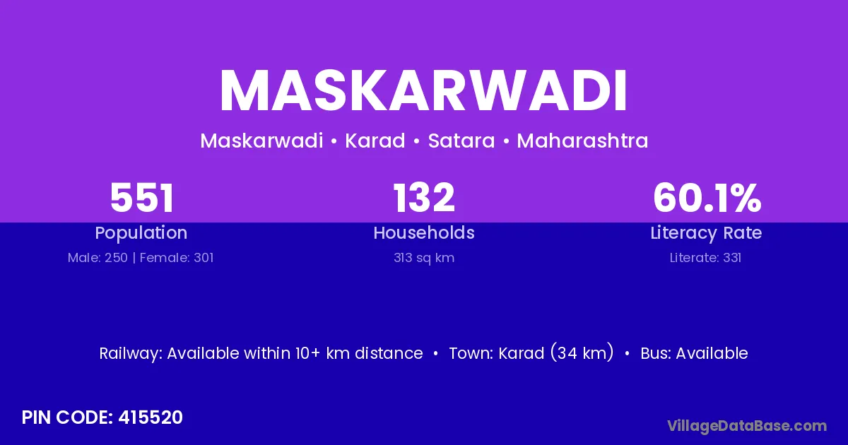 Karad (34 km) is the nearest town to Maskarwadi village for major economic activities and is located approximately 34 km away.