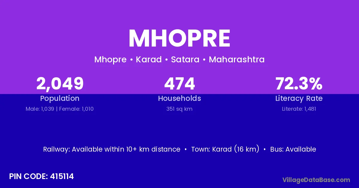 Karad (16 km) is the nearest town to Mhopre village for major economic activities and is located approximately 16 km away.