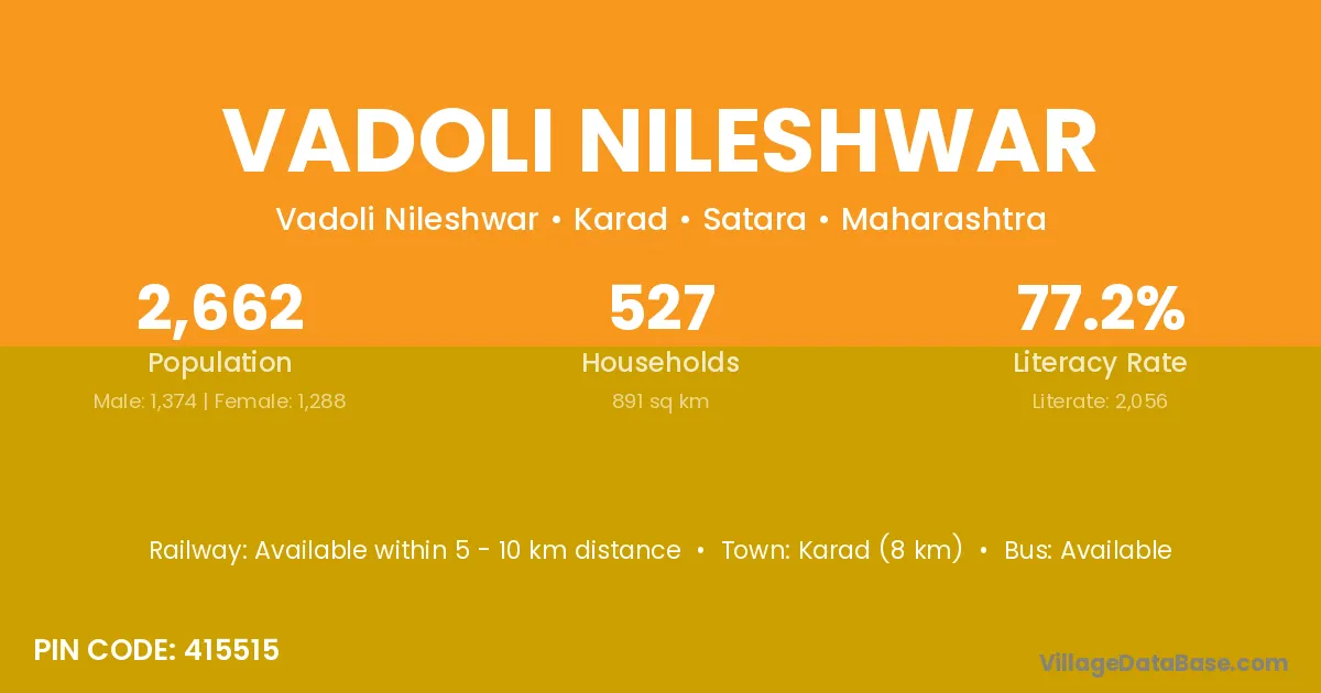 Karad (8 km) is the nearest town to Vadoli Nileshwar village for major economic activities and is located approximately 8 km away.