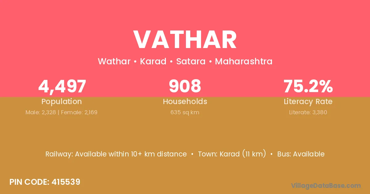 Karad (11 km) is the nearest town to Vathar village for major economic activities and is located approximately 11 km away.
