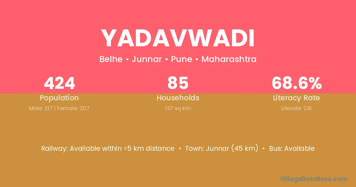 The literacy rate of Yadavwadi village is 73.87%. Male literacy stands at 81.68% and female literacy at 67.31%.