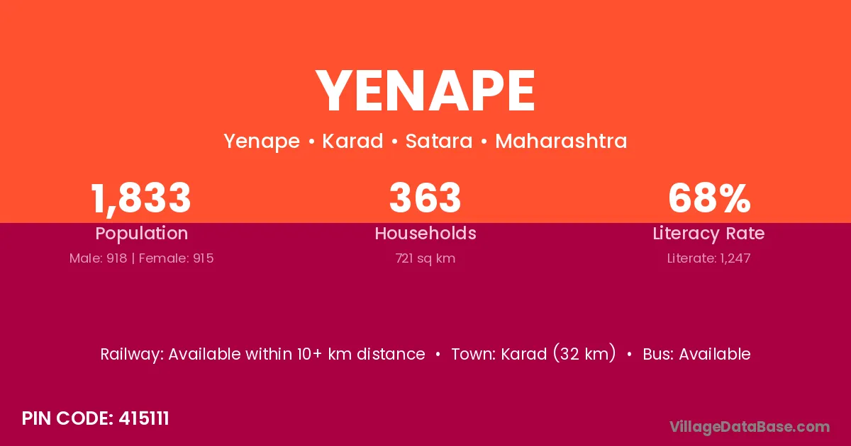 Karad (32 km) is the nearest town to Yenape village for major economic activities and is located approximately 32 km away.