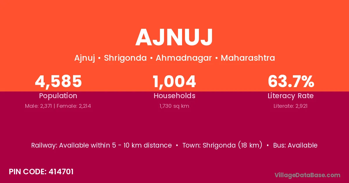 Wai (32 km) is the nearest town to Ajnuj village for major economic activities and is located approximately 32 km away.