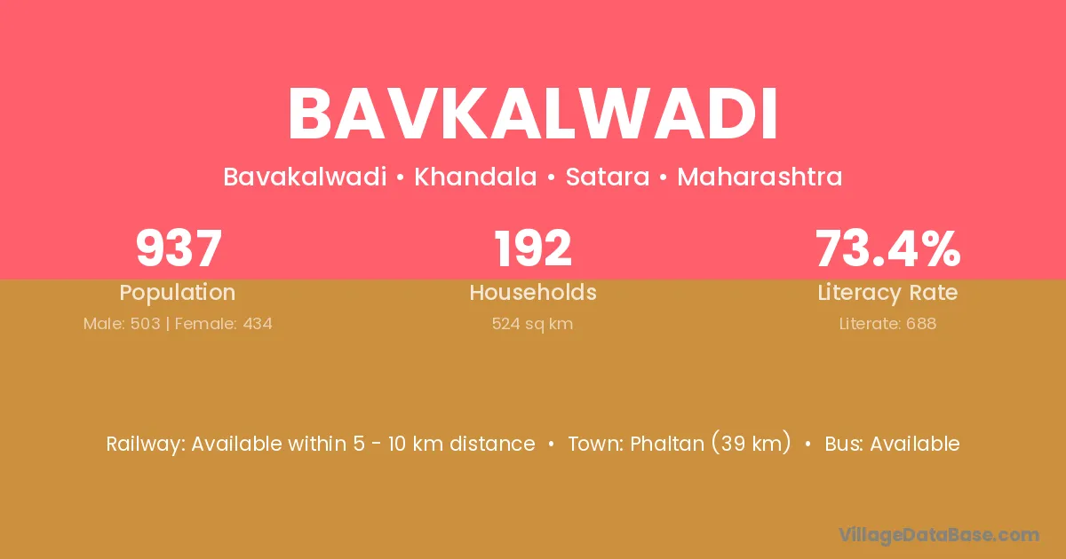 Bavkalwadi village has a total population of 937 people, of which 503 are males and 434 are females.