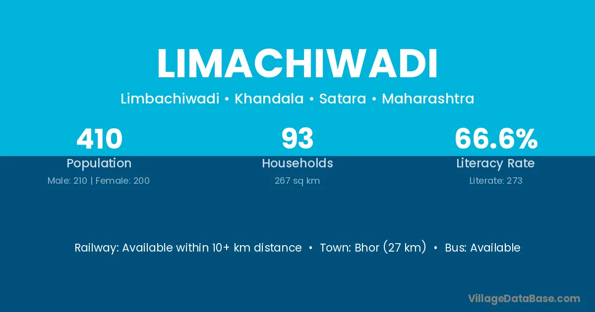 Bhor (27 km) is the nearest town to Limachiwadi village for major economic activities and is located approximately 27 km away.