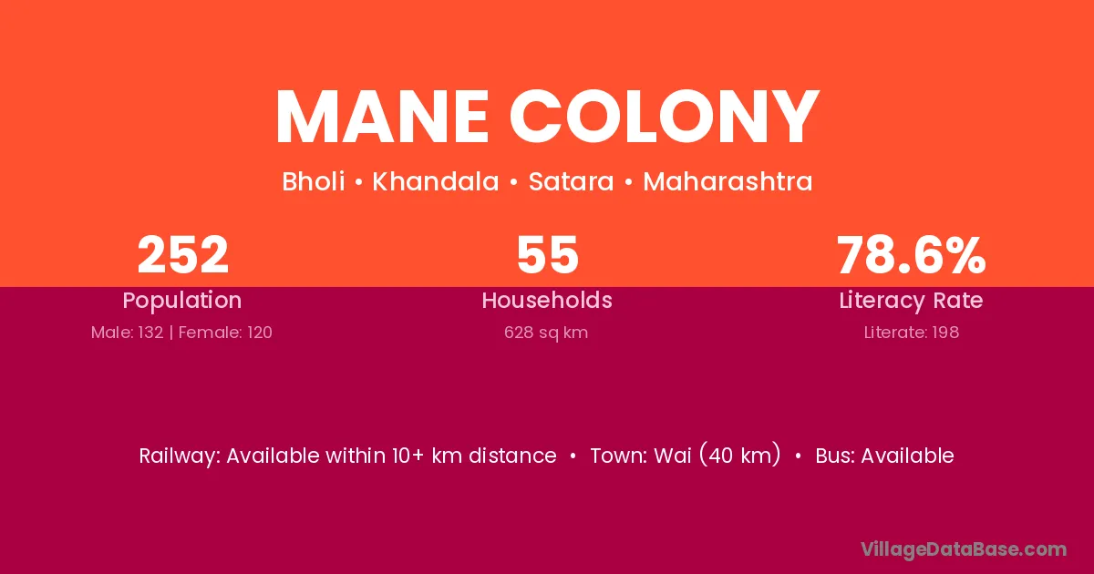 Wai (40 km) is the nearest town to Mane Colony village for major economic activities and is located approximately 40 km away.