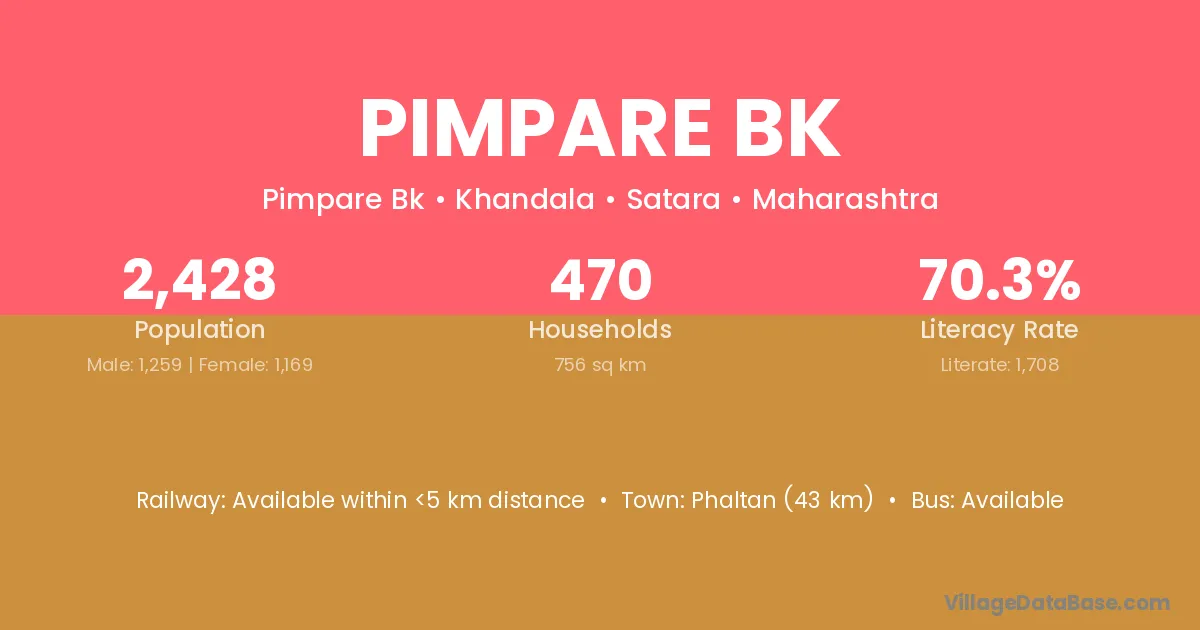 Phaltan (43 km) is the nearest town to Pimpare Bk village for major economic activities and is located approximately 43 km away.