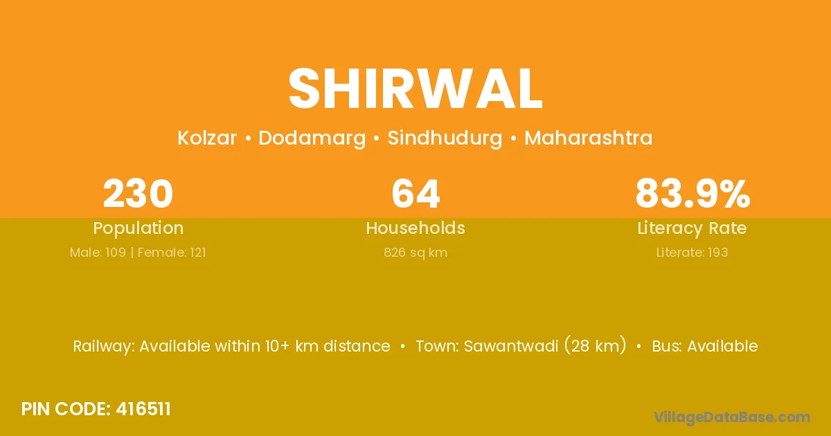 The literacy rate of Shirwal village is 78.43%. Male literacy stands at 81.18% and female literacy at 75.51%.