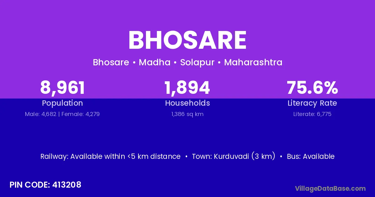 Rahimatpur (16 km) is the nearest town to Bhosare village for major economic activities and is located approximately 16 km away.