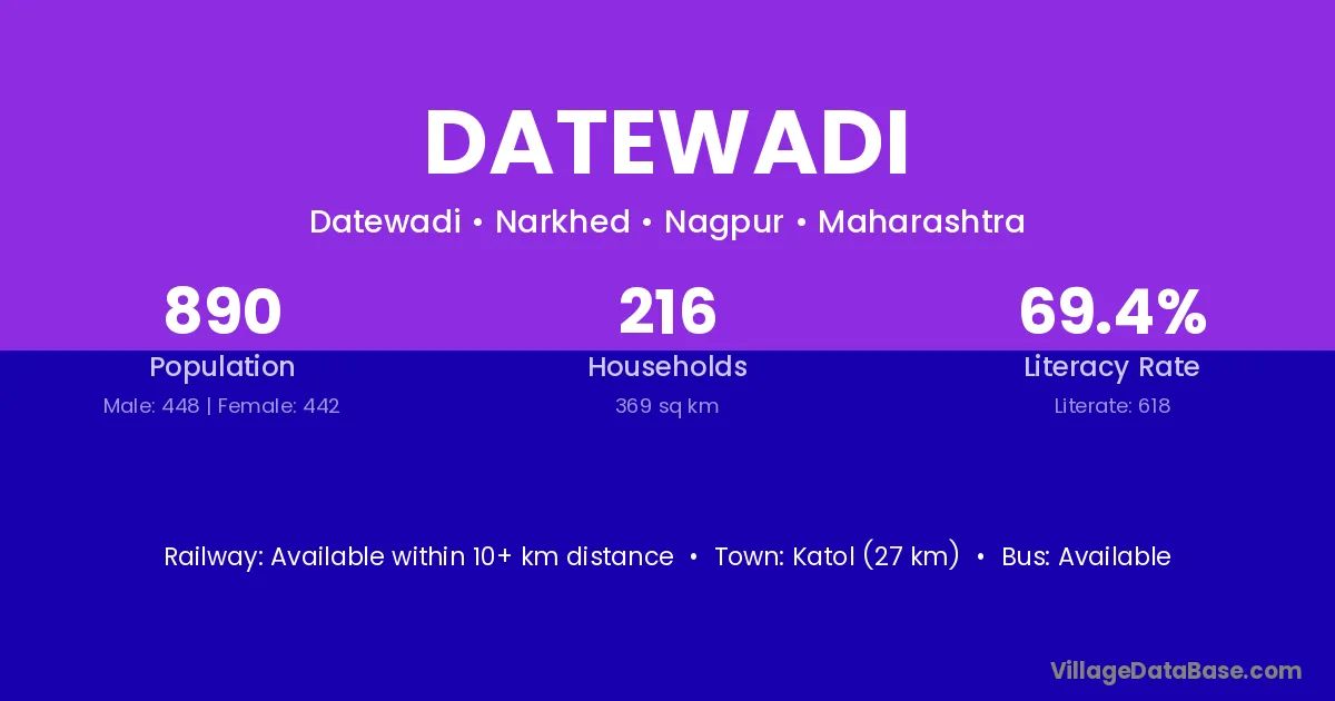 Vita (21 km) is the nearest town to Datewadi village for major economic activities and is located approximately 21 km away.